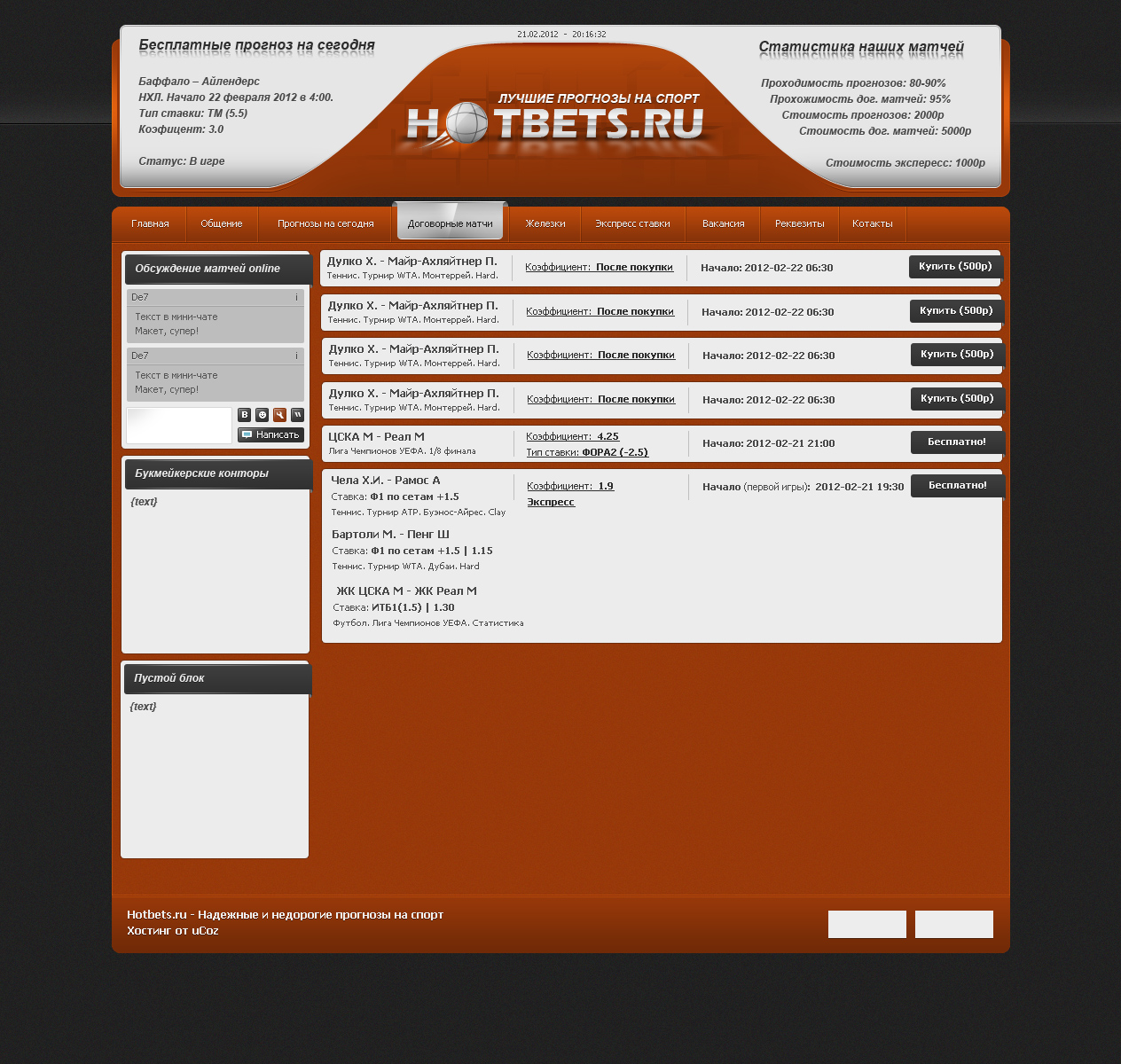 Макет нарисован в серо-темно-оранжевом цвете,состоит из красивых закругленных фигур,был нарисован для сайта которые делает прогнозы на спорт.